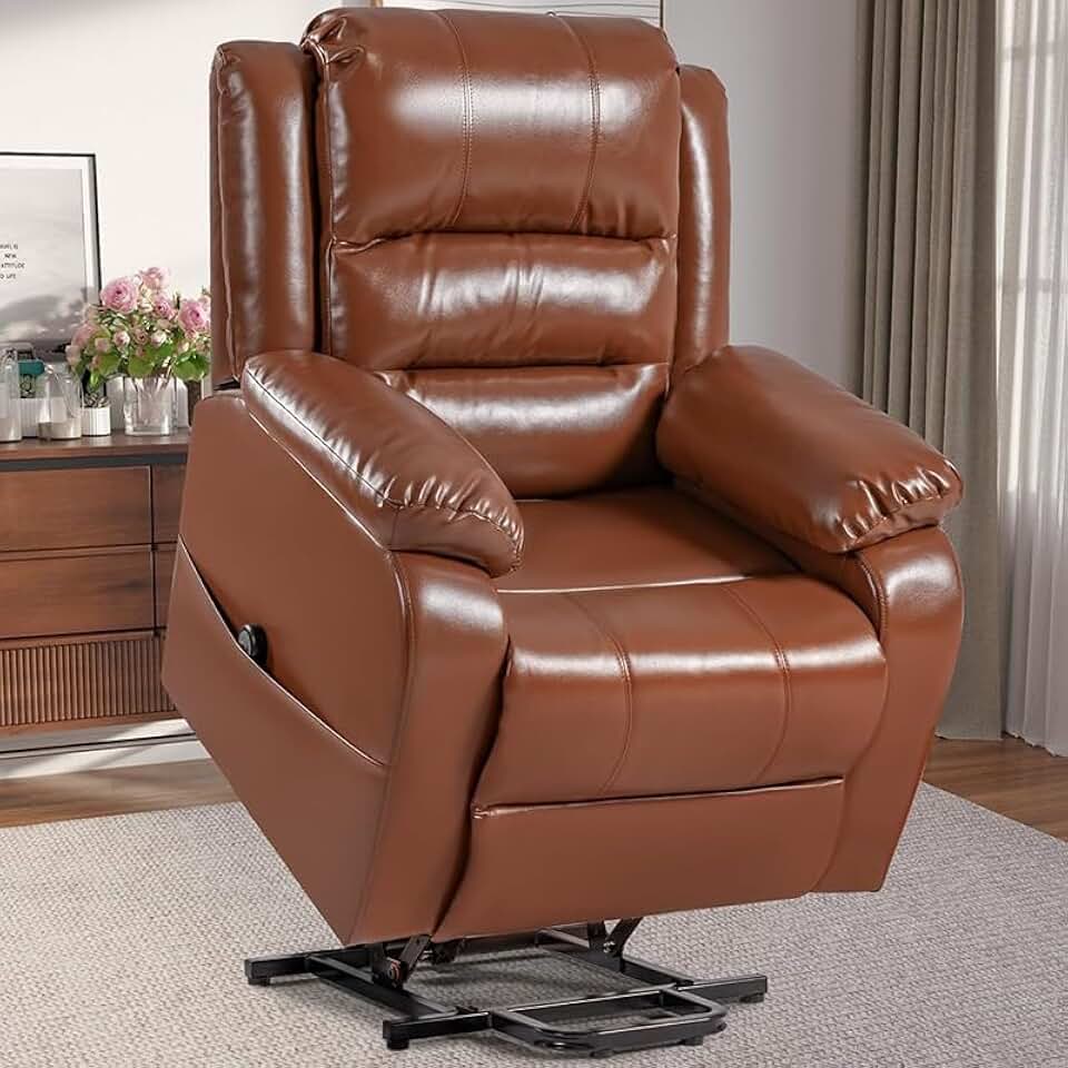 Modern PU Leather Single Electric Reclining Sofas, Genuine Leather Power Lift Recliner Chair for Elderly, Ergonomic Home Theater Reclining Sofa Chair with Side Pockets Remote ControlModern PU Leather