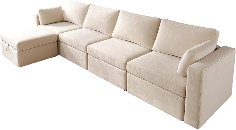Velvet Modular Sectional Sofa Couch, Convertible L Shaped Sofa with Storage Ottomans for Living Room, White, 5 Seats