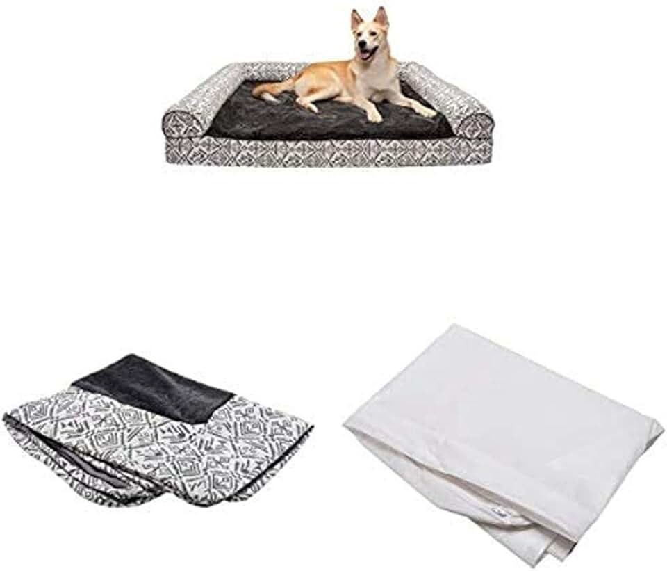 Furhaven Pet Bundle - Jumbo Plus Boulder Gray Memory Foam Plush Kilim Southwest Home Decor Sofa, Extra Dog Bed Cover, & Water-Resistant Mattress Liner for Dogs & Cats