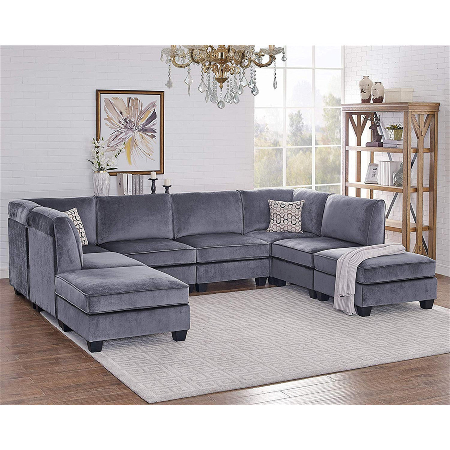 Simona Gray Velvet 8Pc Modular U Shape L Shape Sectional Sofa