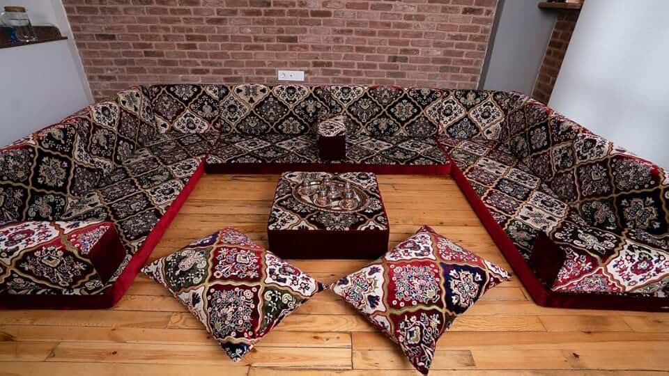 Afghan Kilim Velvet Fabric Sofa Couch, Diwan Sofa, Sectional Sofa Couch, Bench Cushions, Arabic Seating Set, Turkish Sofa, Majlis Sofa, Maroon U Shaped Arabic Floor Sofa (U Sofa Full Set)