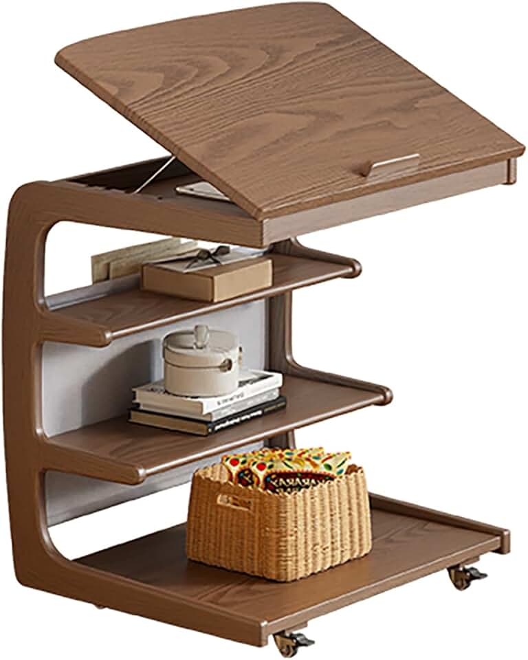 Wooden Dorm Bedside Table with Wheels, 4-Layer Storage Sofa Table - Lightweight End Table Accent Table for Living Room, Bedroom - Couch Side Table Nightstand with Flip Desktop - Portable and Stylish
