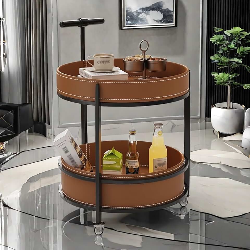 2-Layer Round Dorm Side Table with Wheels, Leather Sofa Table, Iron Frame Bedside Table Nightstand - Accent Table for Living Room, Bedroom