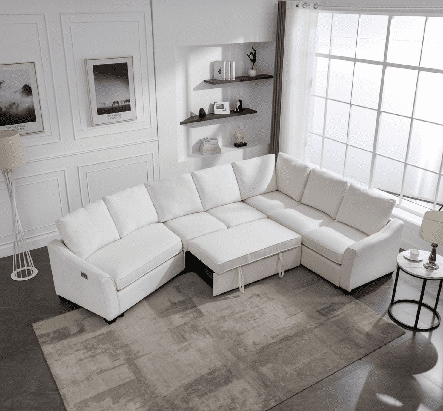 Euroco Sectional L Shaped Sofa with Pull-Out Bed, 129.5" Living Room Sofa Couch, Sleeper Sofa with USB Charging Port, Beige