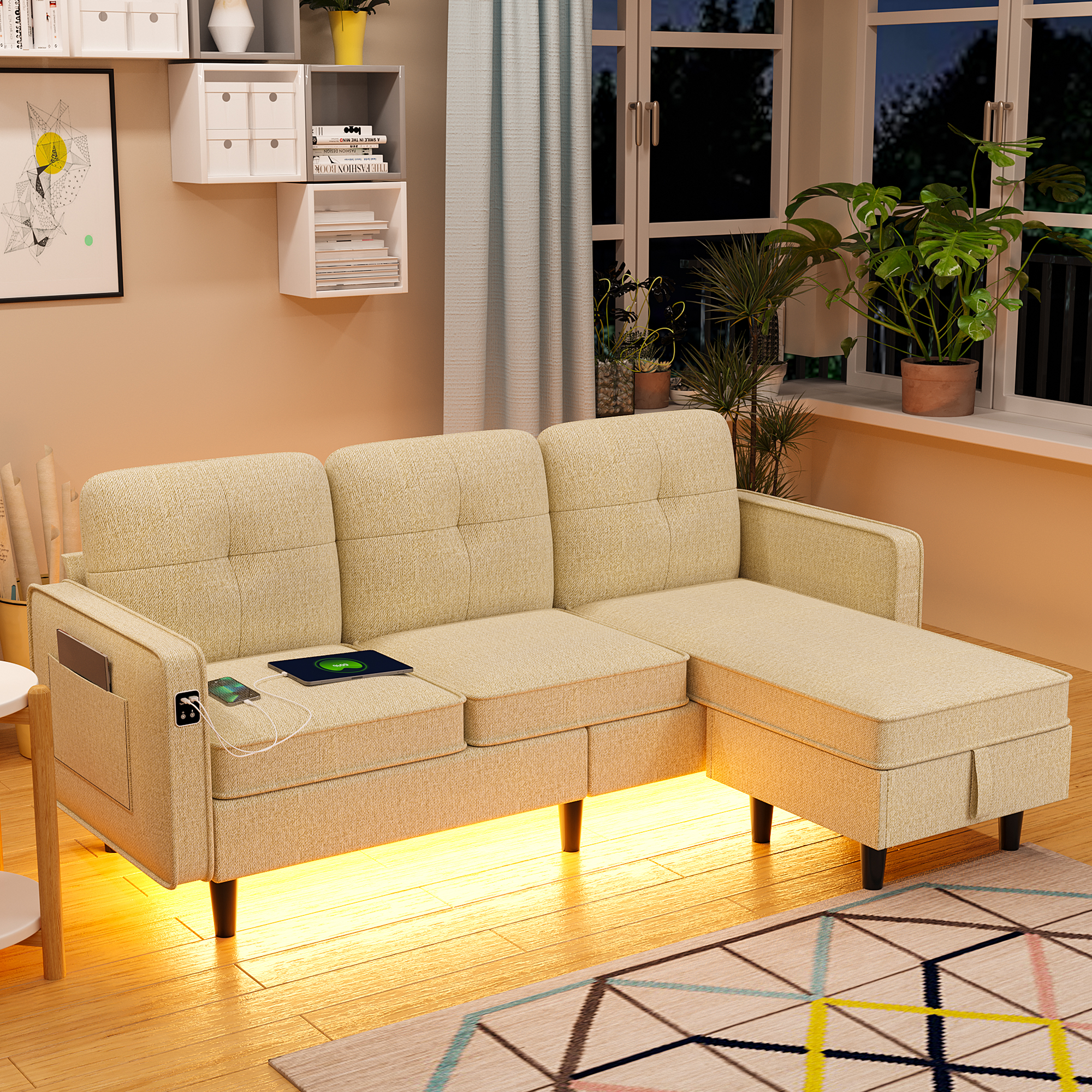 HNEBC Convertible Sectional Sofa Couch with LED Lights/USB/Type C Port, Modern L Shaped Couch with Human Body Induction, Reversible Sectional Couches with Storage Ottoman for Living Room (Beige)