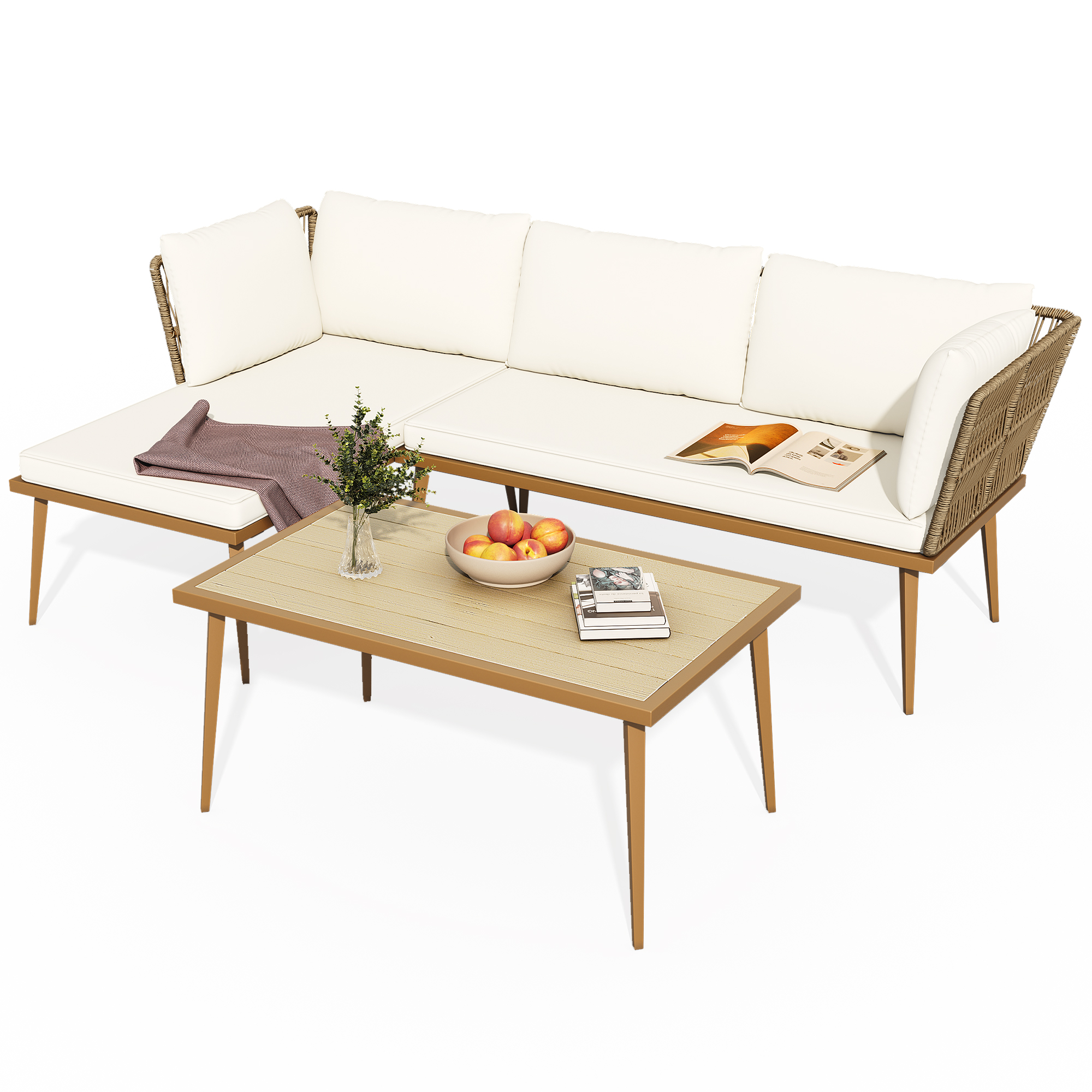 DWVO L-Shaped Patio Sofa Conversation Set, Wicker Boho Patio Furniture, L-Shaped Sofa ( With Cushions ) and Coffee Table for Patio, Balcony, Backyard, Deck - Beige