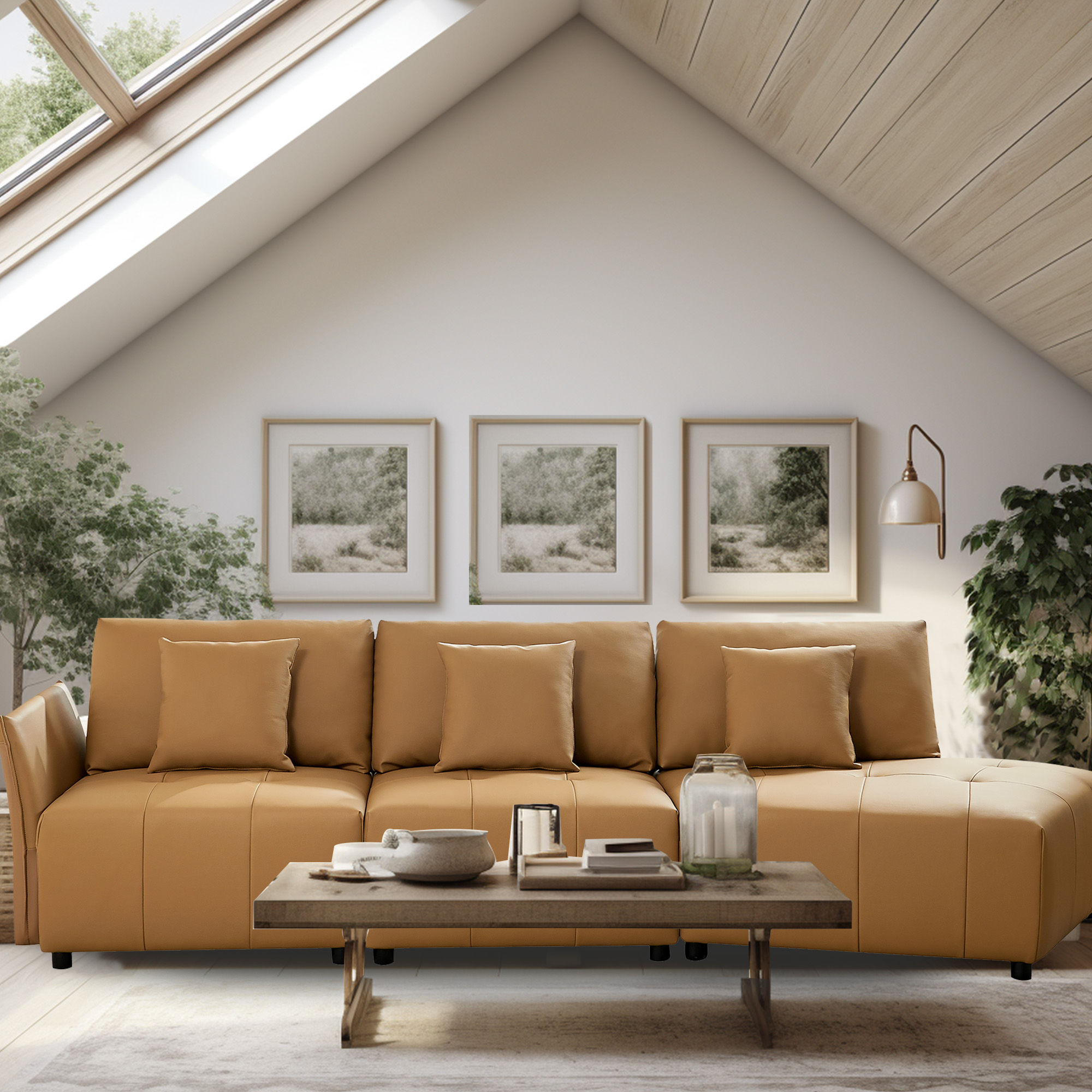 Youdao Modern Living Room Curved Sofa, 3-Seater Upholstered Sectional Couch, Leather Corner Sofa Home Office Furniture ,with 3 Thorw Pillows, for Apartment, Business Lounge, Waiting Area, Hotel Lobby