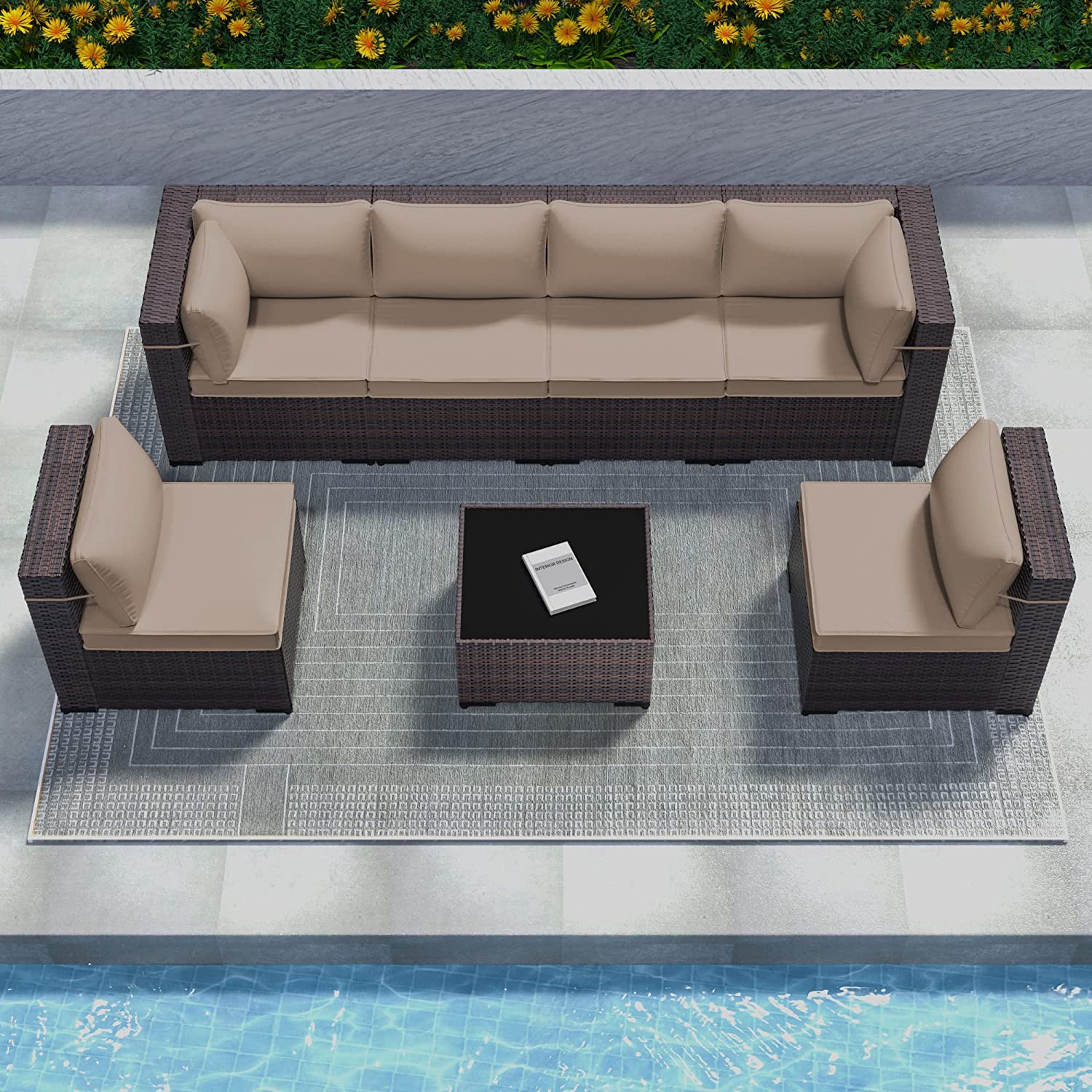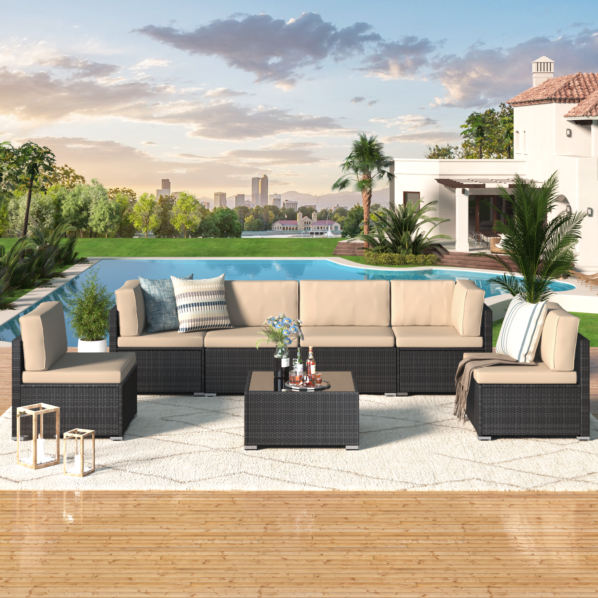 YODOLLA 7-Piece Outdoor Furniture Set, Black Rattan Wicker Sectional Sofa Couch Patio Conversation Set with Table In Beige