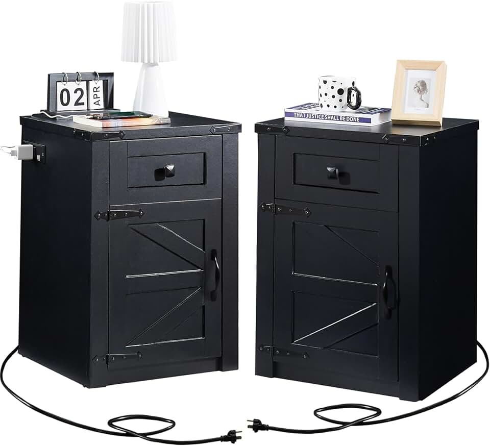 SOOWERY Nightstands Set of 2, Nightstand with Charging Station, Farmhouse End Table with Barn Door and Drawer, Rustic Wood Sofa Side Table for Bedroom, Living Room, Black