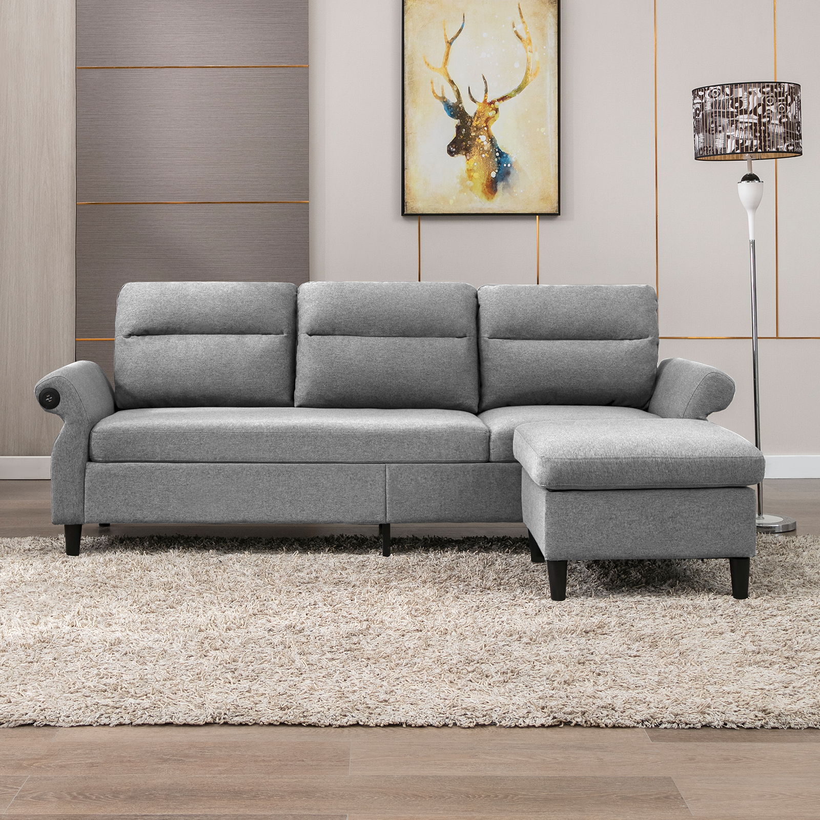 Mjkone Modern 88" W Convertible Sectional Sofa Couch with 2 USB Ports and Adjustable Armres,3 Seat L-Shape Sofa Couch with,Ottoman for Living Room,Apartment , Linen Fabric,Light Grey