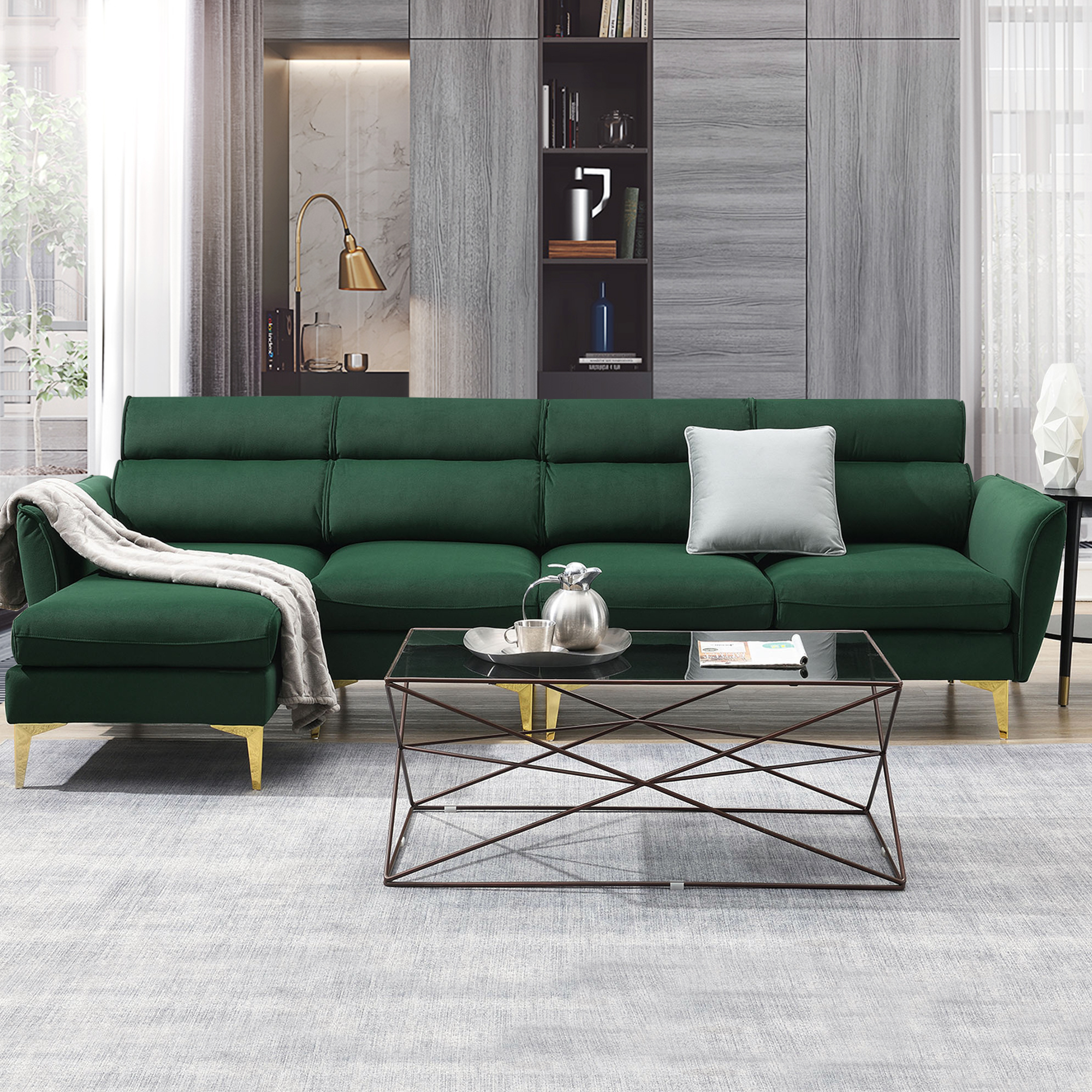 Euroco 110" Sectional Sofa Set with Convertible Chaise lounge, L Shape Sofa for Living Room, Flannel Couch, Green