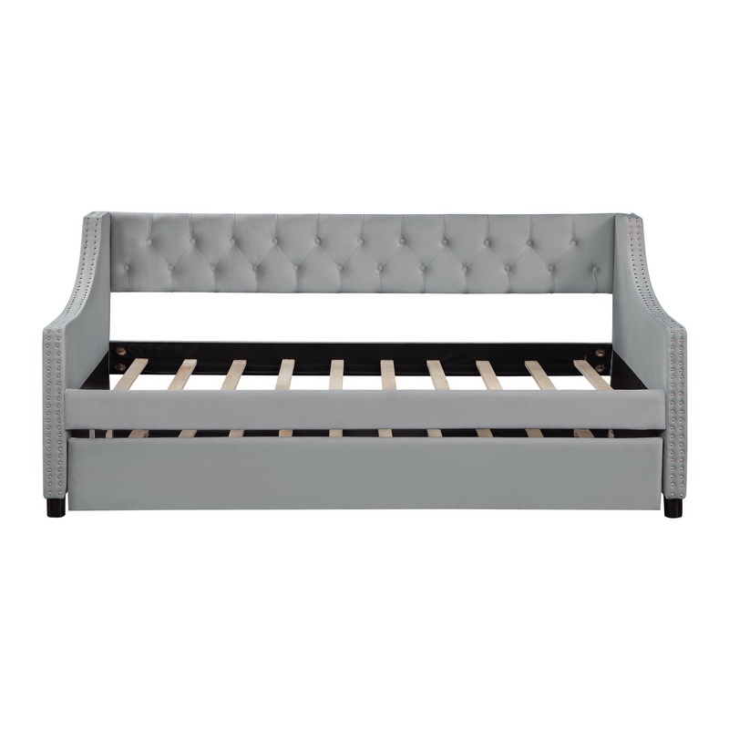 Daybed with Trundle Upholstered Tufted Sofa Bed, with Button and Copper Nail on Arms, Both Full Size Beige