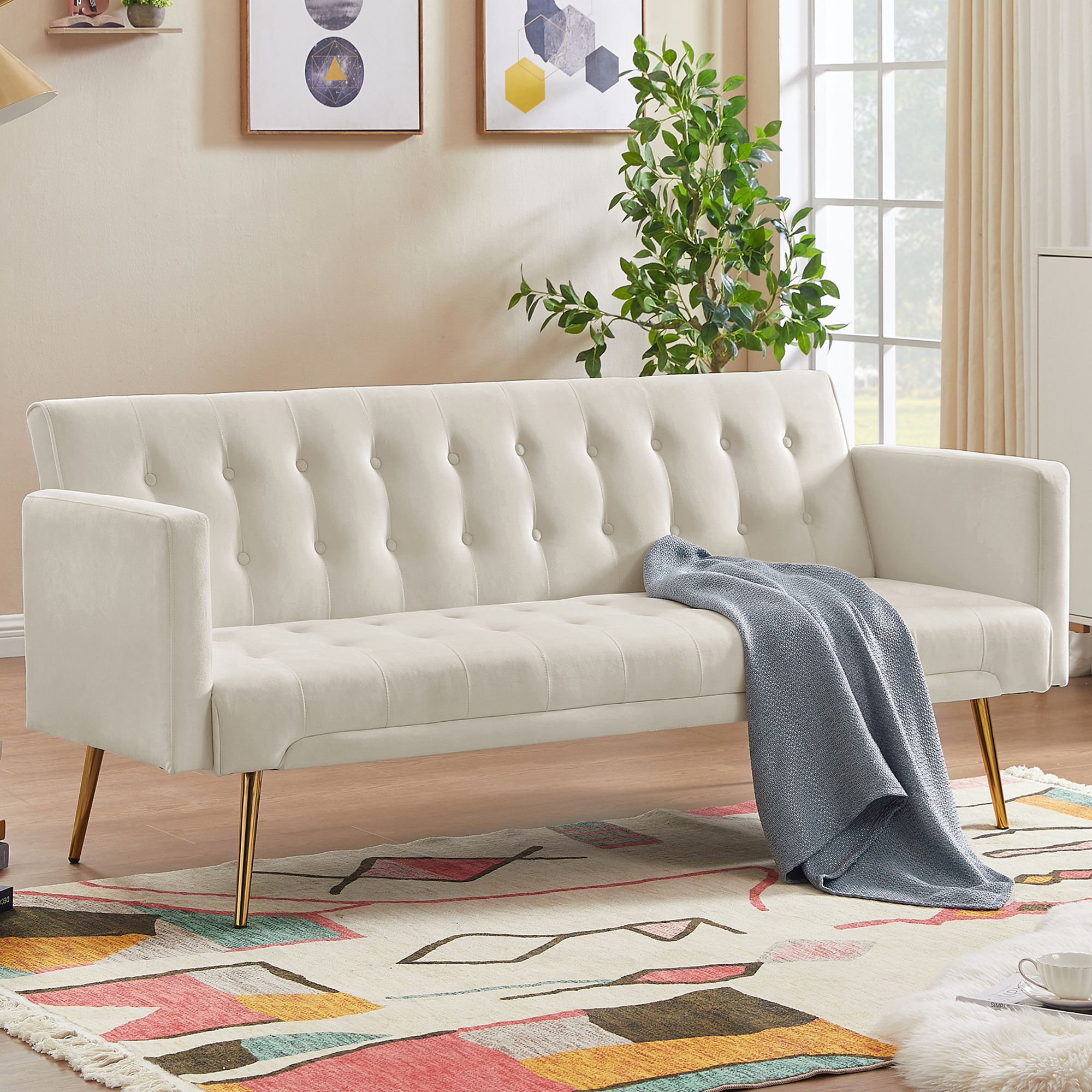 SYNGAR Couches for Living Room, Velvet Upholstered Convertible Sofa Bed with Armrests, Metal Legs, Adjustable Backrest, Mid Century Futon Sofa and Couch for Home Apartment Living Room, Beige