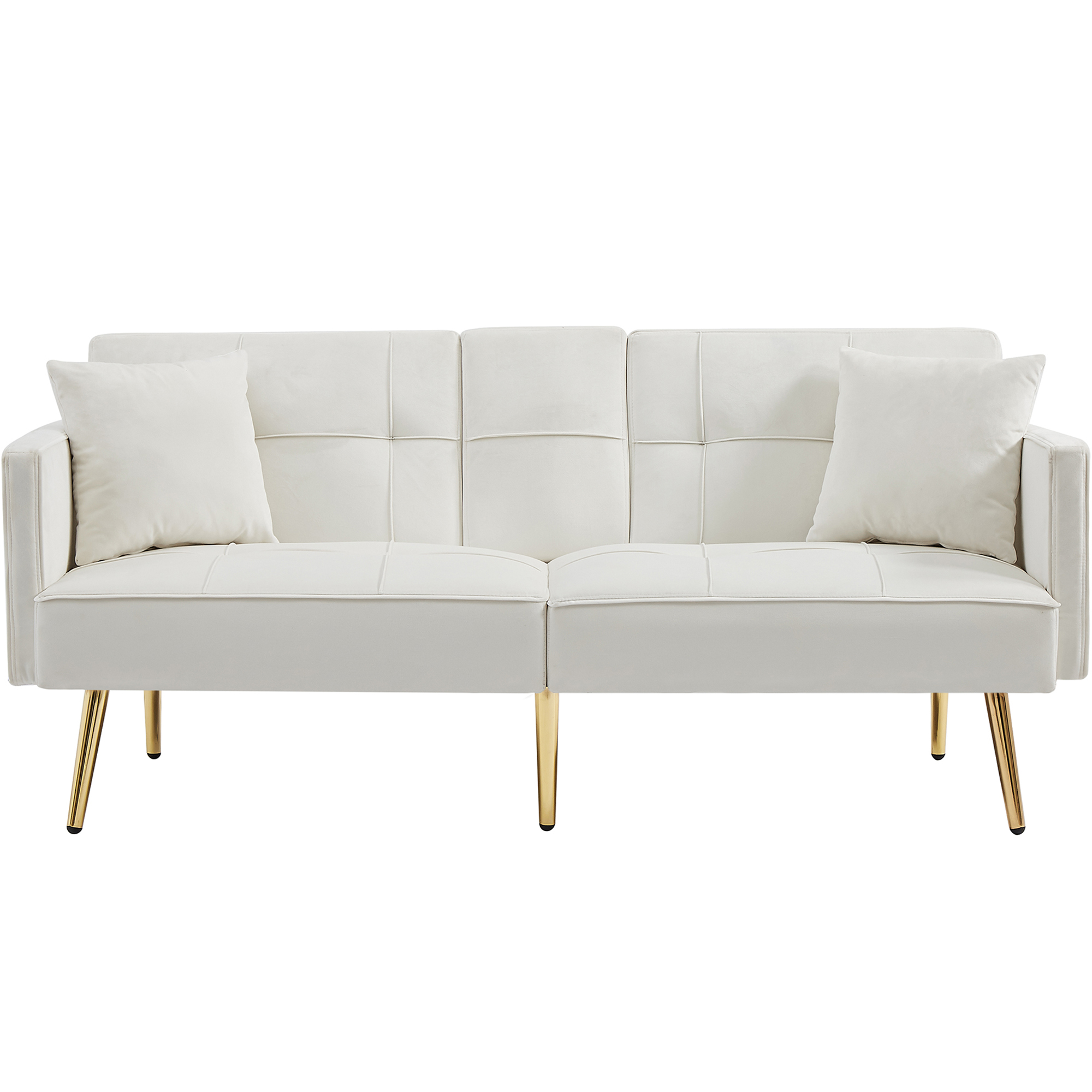 SYNGAR Sofas for Living Room, Velvet Upholstered Futon Sofa Bed Modern Convertible Folding Futon Lounge Couch for Apartment Dorm, Home Furniture Futon Sofa/Bed with Armrest, Gold Metal Legs, White
