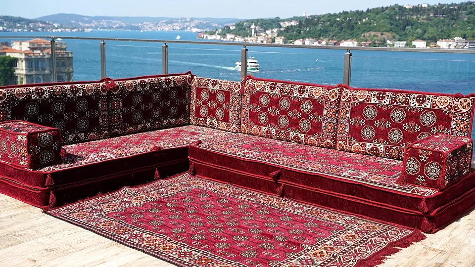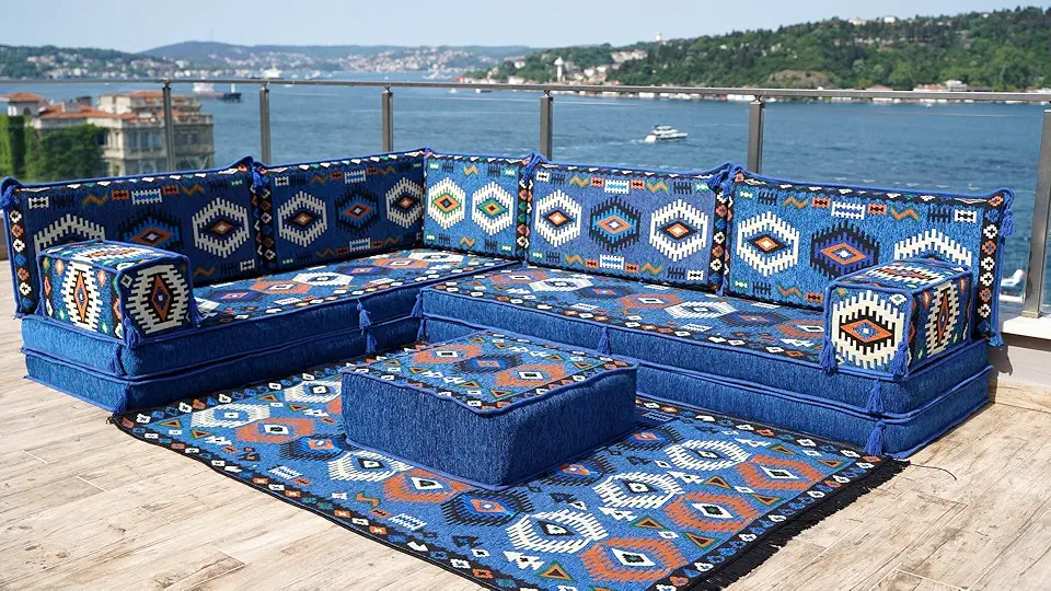 Handmade Livingroom Sofas, Durable Fabric, Moroccan Home Decor, Arabic Floor Sofa, Turkish Floor Sofa, Moroccan Sofas, Arabic Majlis, Futon Sofa Bed (L Sofa + Rug + Ottoman, 8'' Thickness (20 cm))
