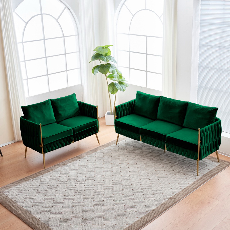 2 Pieces Velvet Sofa Couch Set, Comfy Lovesea and 3 Seater Sofa,Upholstered 2 Seater Sofa with 3 Seater Couch, Handmade Woven Back Couch Set for Living Room, Green Velvet W714S00362