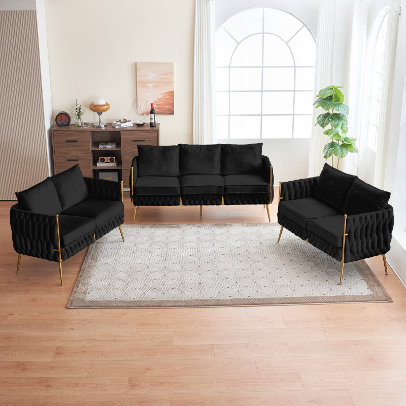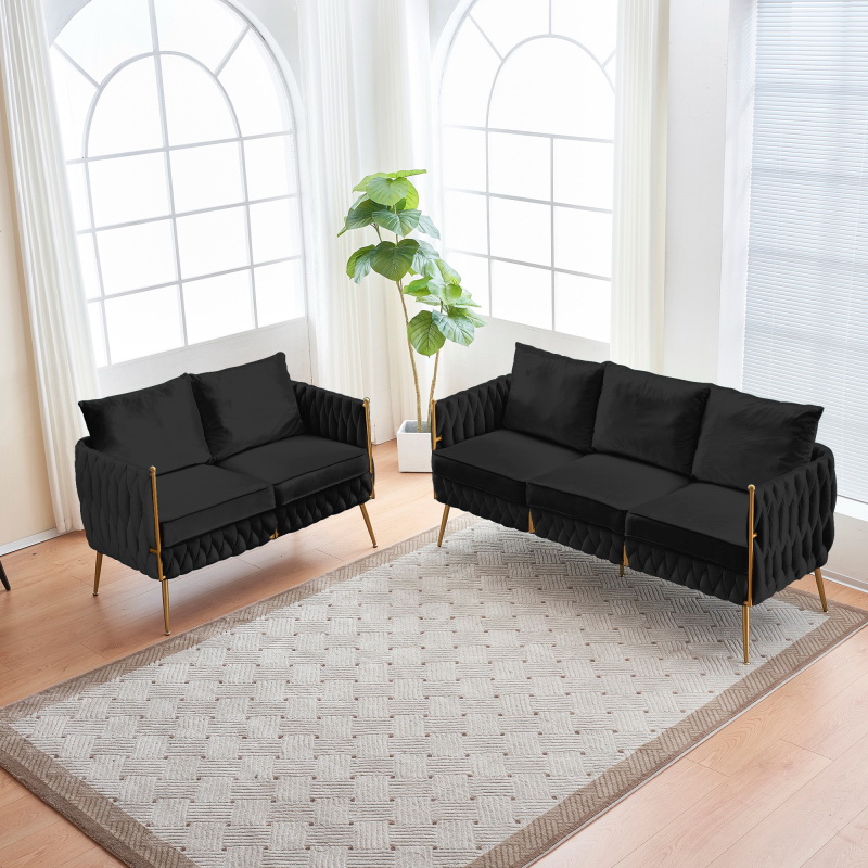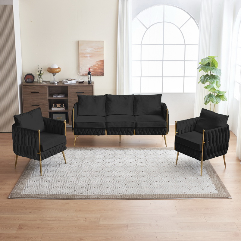Handmade Woven Velvet Back and Sides Sofa Set, One Accent Chair and One 3 Seater Sofa, Gold Frame and Gold Legs, Living Room Sofa Sets for Living Room, Black Velvet W714S00377
