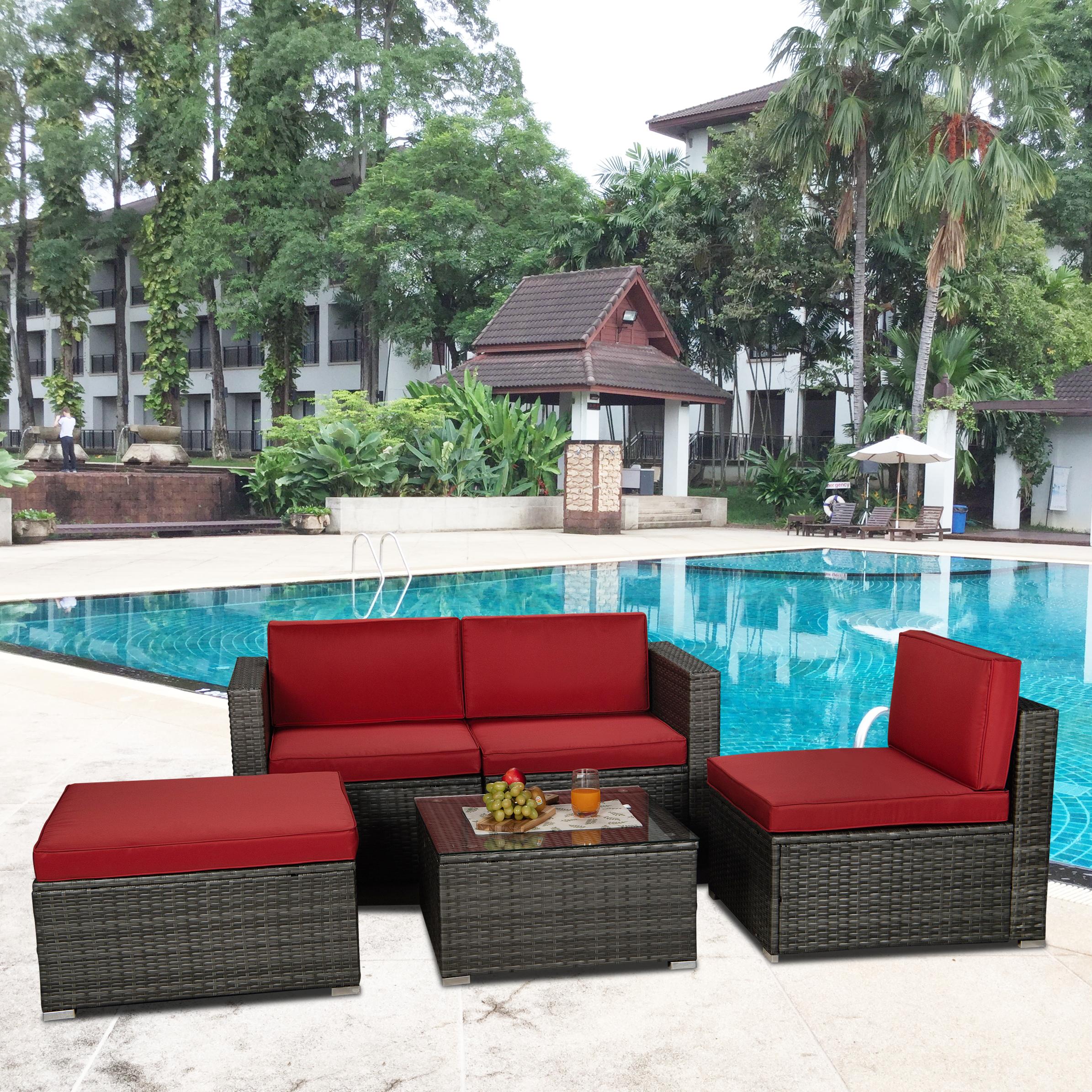 5 Pieces Outdoor Conversation Set, Cushioned Patio Furniture Set 4-seat with Table, All-Weather Rattan Sectional Sofa Set Backyard Porch Garden, Red Cushions