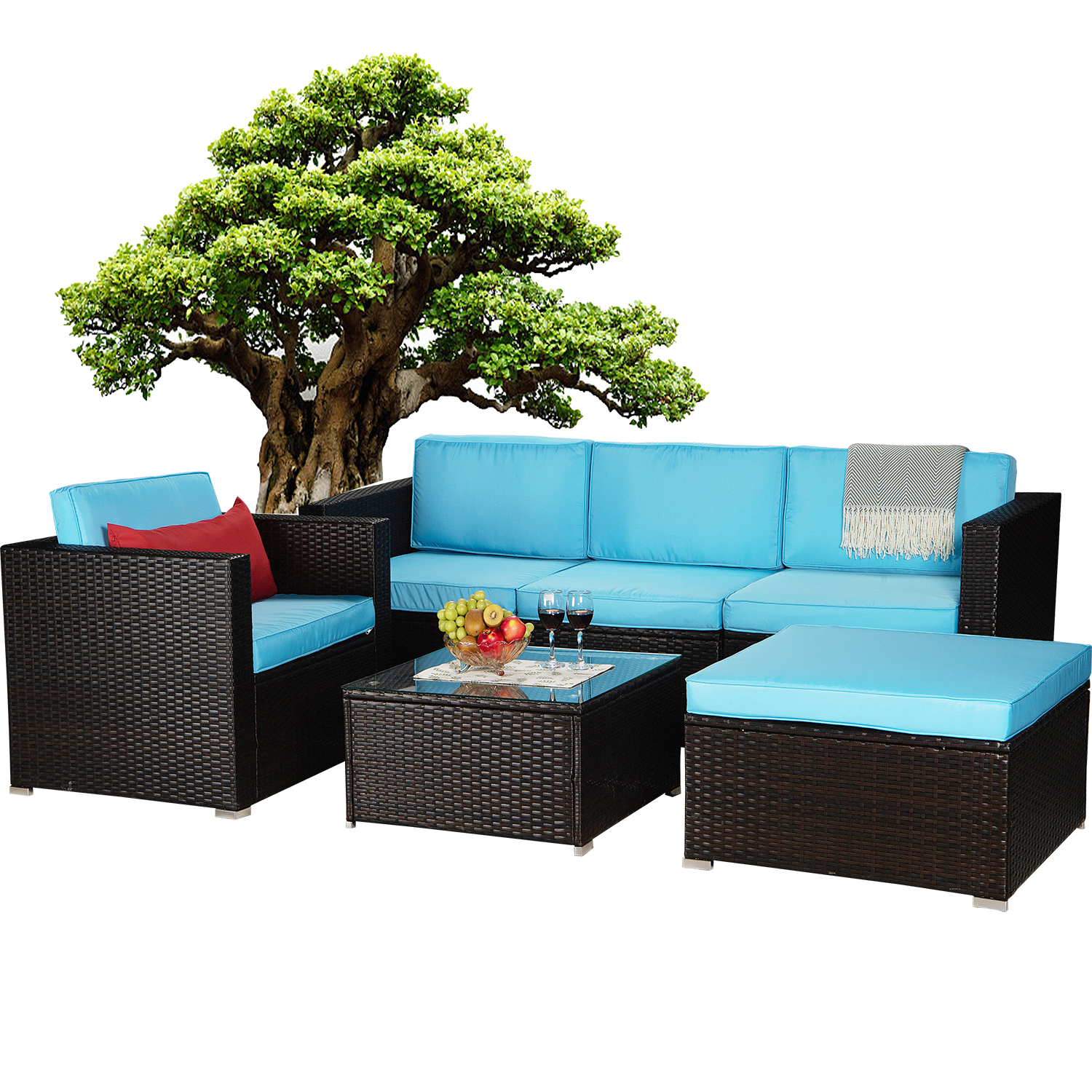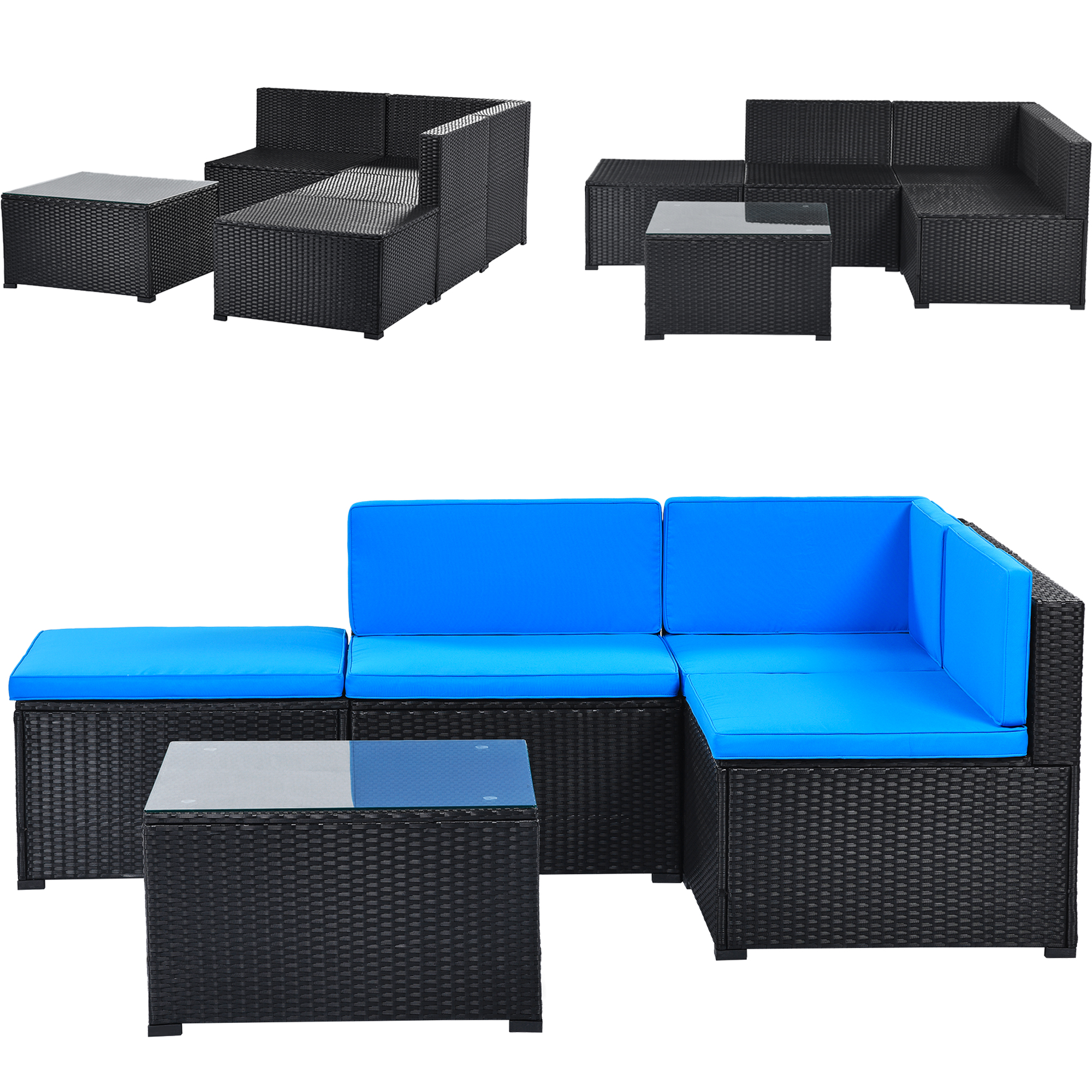Seizeen Patio Sofa Set, Outdoor Conversation Set, Sectional Cushioned Sofa & 1 Glass Table, All-Weather Rattan Furniture Set, Blue