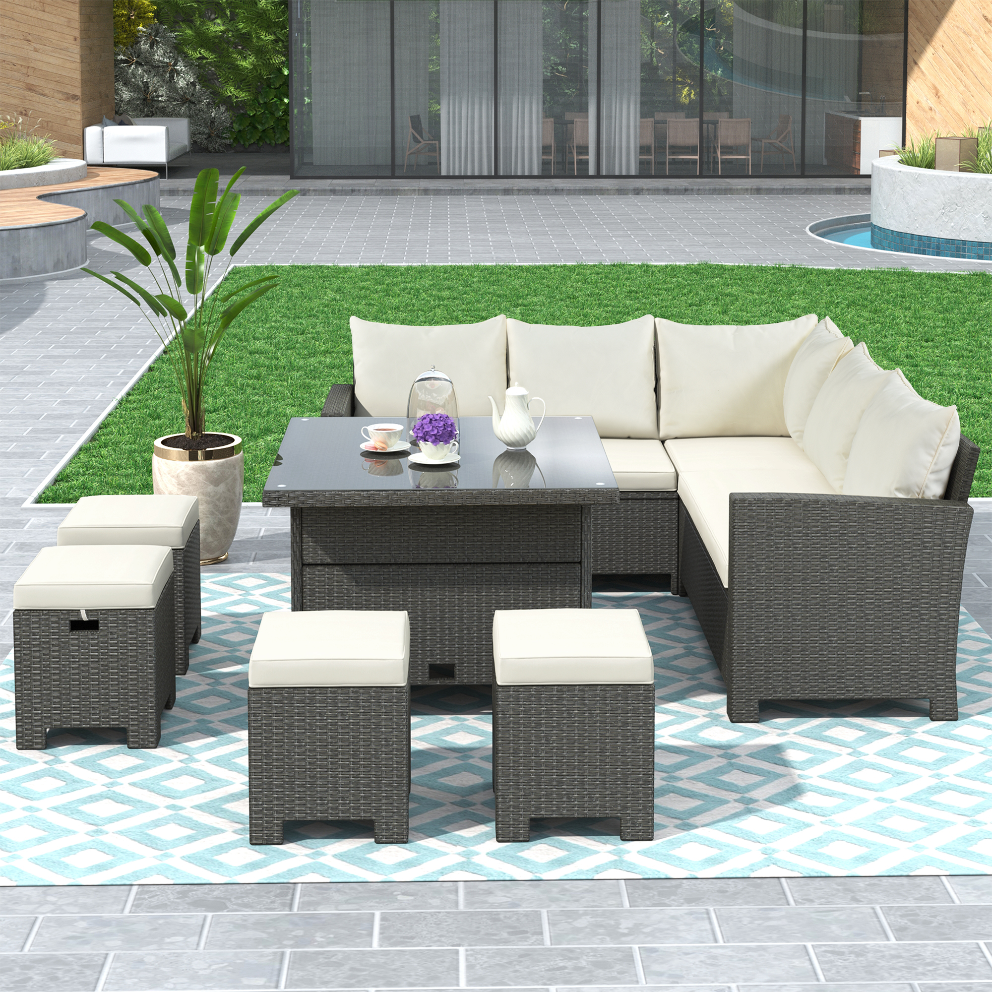 6 Pieces Patio Sofa Set, Seizeen Outdoor PE Rattan Patio Furniture Set with Table Ottomans Cushions, Patio Sectional Conversation Set for Garden Deck Backyard, Gray