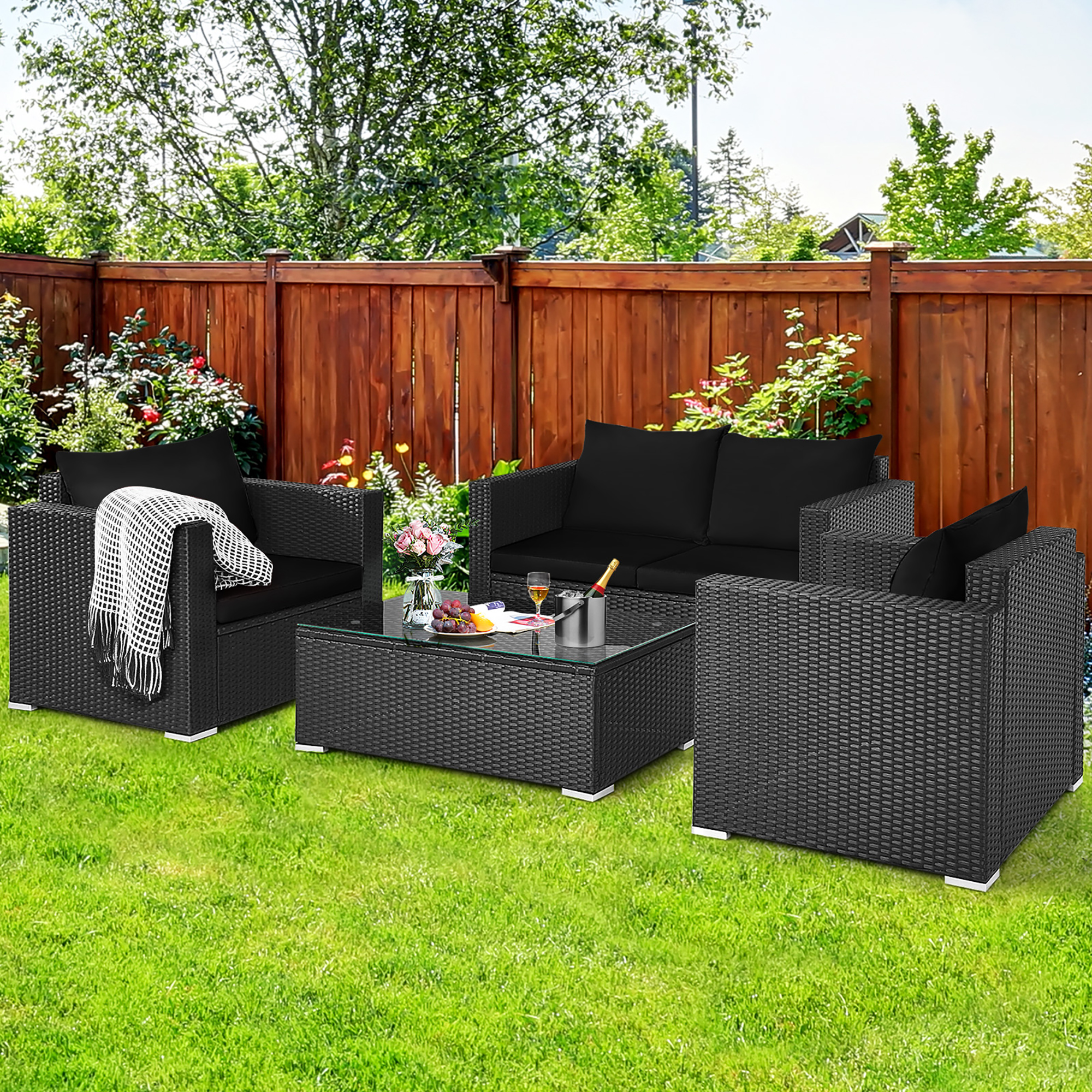Costway 4PCS Patio Rattan Furniture Set Cushioned Sofa Chair Coffee Table Black