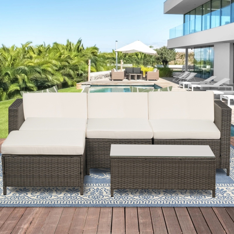 Convertible Sofa Patio Outdoor Rattan Wicker Brown Beige Couch Sectional Sleeper Sofa Set Coffee Table of 5 Pieces Furniture W1828S00042
