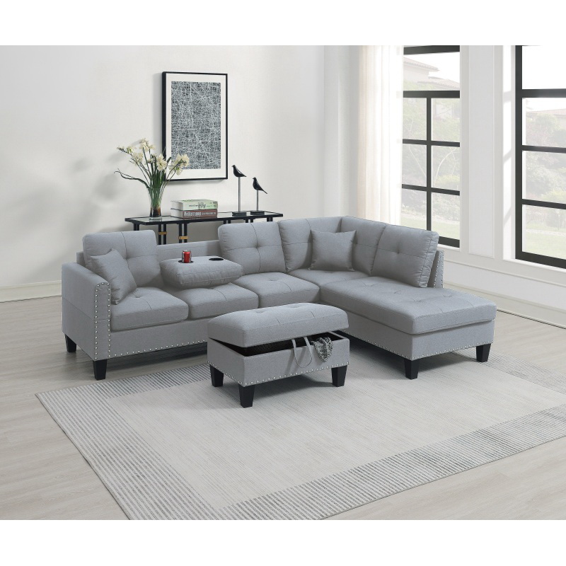Grey Faux Leather Living Room Furniture 3-PCS Sectional Sofa Set LAF Sofa RAF Chaise and Storage Ottoman Cup Holder Couch B011S00671