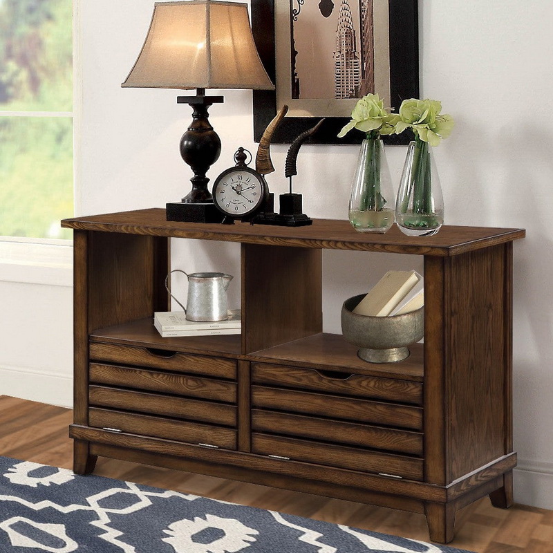 Benjara BM204476 Slatted Front Sofa Table with Two Drawers and Two Shelf, Brown