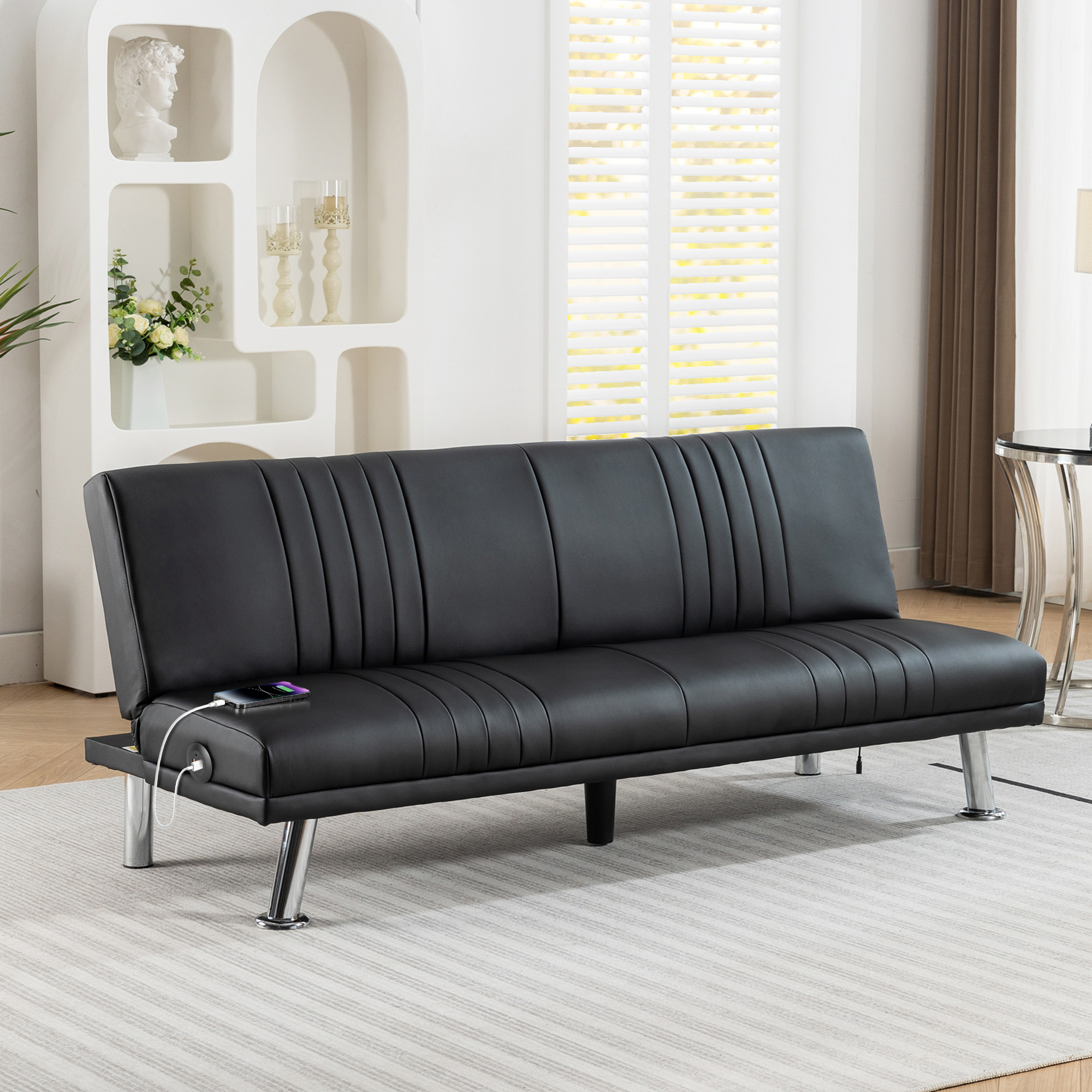 VECELO 65" Faux Leather Futon Sofa Bed With Dual USB Charging Ports, Modern Folding Sleeper Couch for Living Room, Office, Apartment, Black