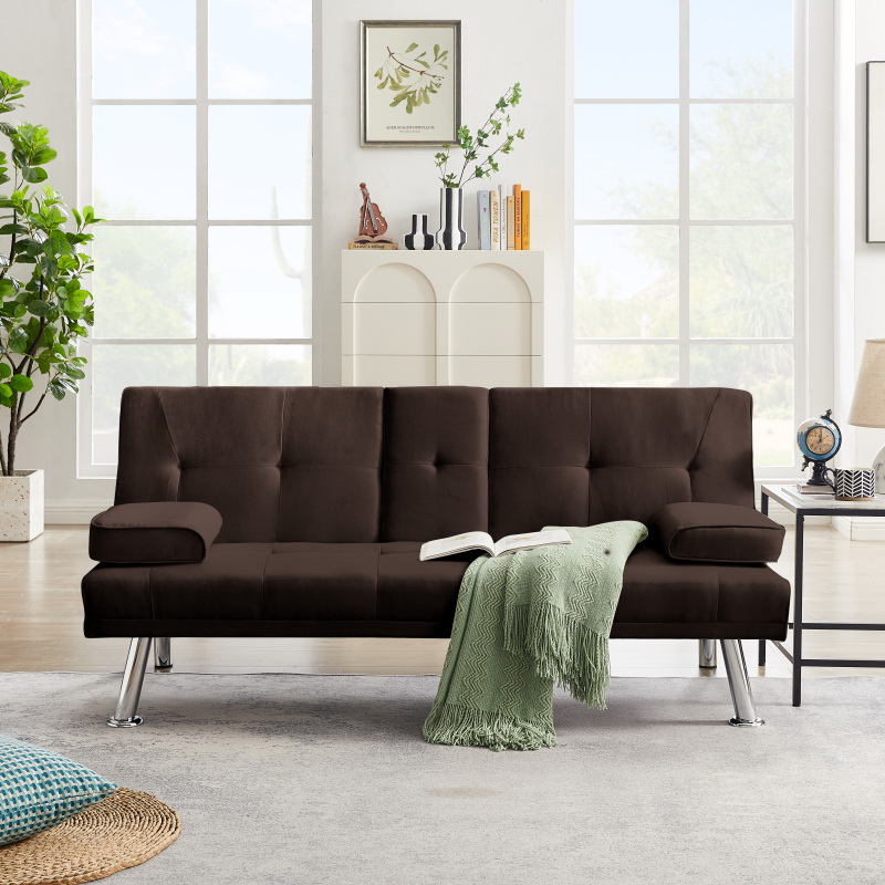 100% Fabric Linen Upholstered Modern Convertible Folding Futon Sofa Bed for Compact Living Space, Apartment, Dorm/Removable Armrests, Metal Legs, 2 Cupholders
