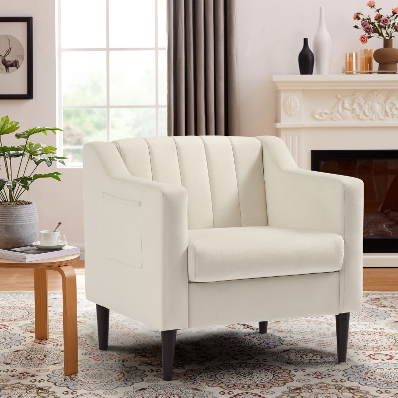 GOLDSUN Velvet Fabric Accent Chair Lazy Reclining Armchair with Removable Metal Legs and a Side Pocket, Comfy Upholstered Single Leisure Sofa Chair for Living Room, Bedroom, Office (Beige)