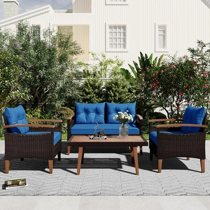 Bayfeve 4-Piece Garden PE Rattan Outdoor Sofa Set 4-Piece Wicker Patio Conversation Set with Blue Cushions
