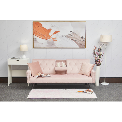 1730 Sofa Bed Armrest with Nail Head Trim with Two Cup Holders 72" Green Velvet Sofa for Small Spaces W127850852