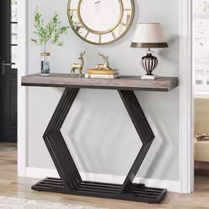 Turrella 42.5 in. Grey Rectangle Wood Console Table with Geometric Metal Base, Entryway Sofa Table Narrow Long