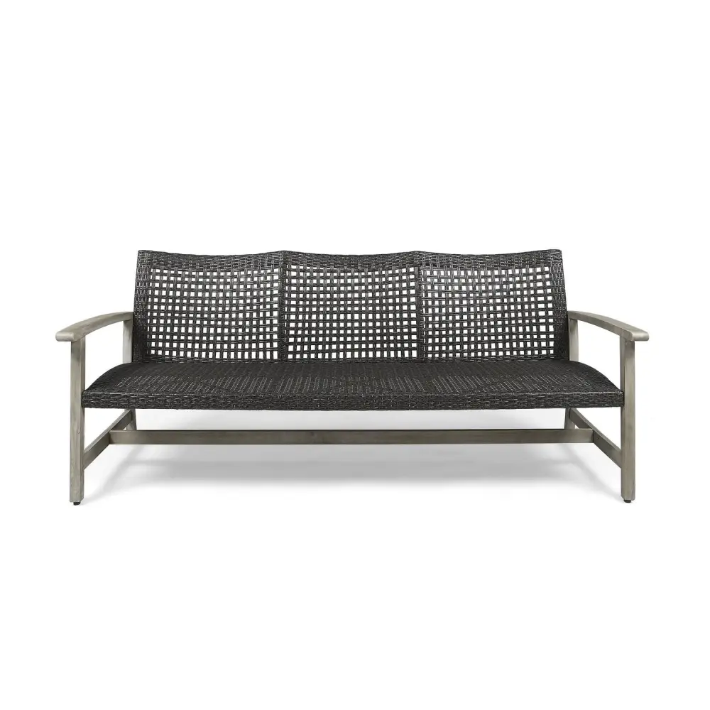 Marcia Outdoor Wood and Wicker Sofa, Light Gray Finish with Mix Black Wicker