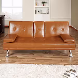 HOMESTOCK Caramel, Futon Sofa Bed Faux Leather Futon Couch with Armrest 2-Cupholders, Sofa Bed Couch Convertible with Metal Legs