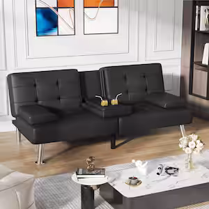 65 in. Convertible Folding Futon Sofa Bed, Black Faux Leather Upholstered Roomy Love Seat