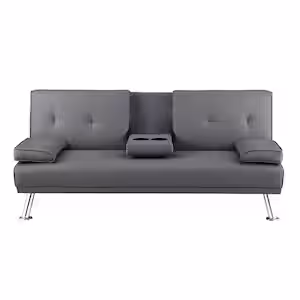 MAYKOOSH Gray, Futon Sofa Bed Faux Leather Futon Couch with Armrest and 2-Cupholders, Sofa Bed Couch Convertible with Metal Legs