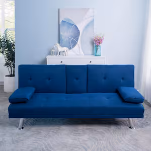 Blue, Futon Sofa Bed Faux Leather Futon Couch with Armrest 2-Cupholders, Sofa Bed Couch Convertible with Metal Legs