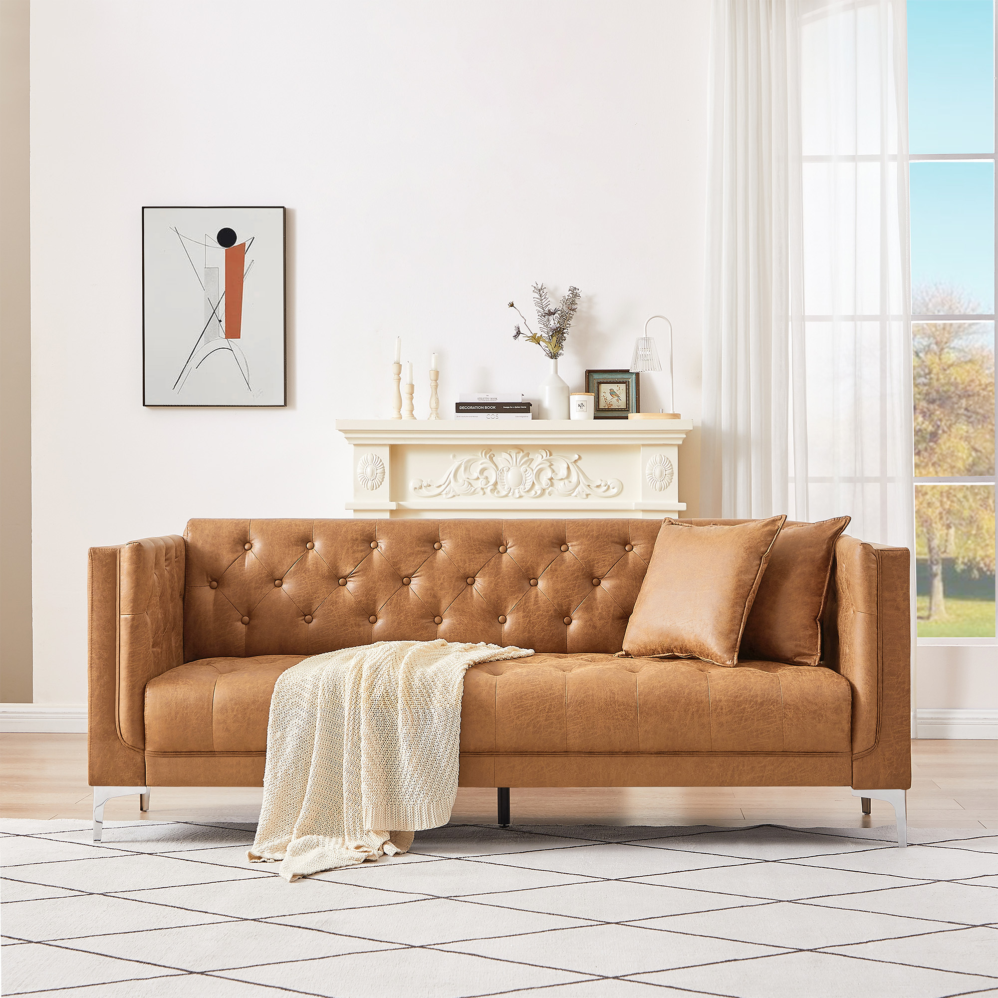 Homfa 78.3" 3-Seater Sofa, Leathaire Upholstered Handmade Tufted Couch with Armrests & 2 Pillow for Living Room, Camel