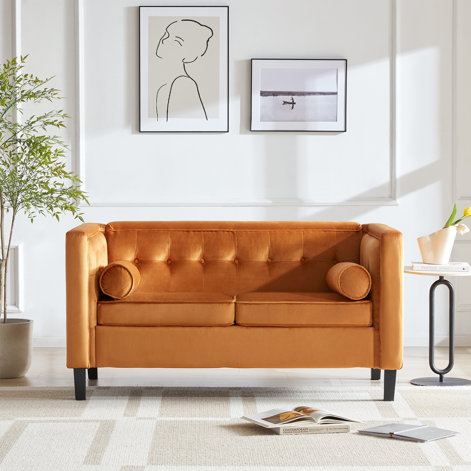 Dreamsir 58" W Velvet Sofa, Mid-Century Modern Love Seats Sofa Furniture with Two Bolster Pillows, Button Tufted Couch for Living Room, Easy Assembly (Loveseat, Ginger)