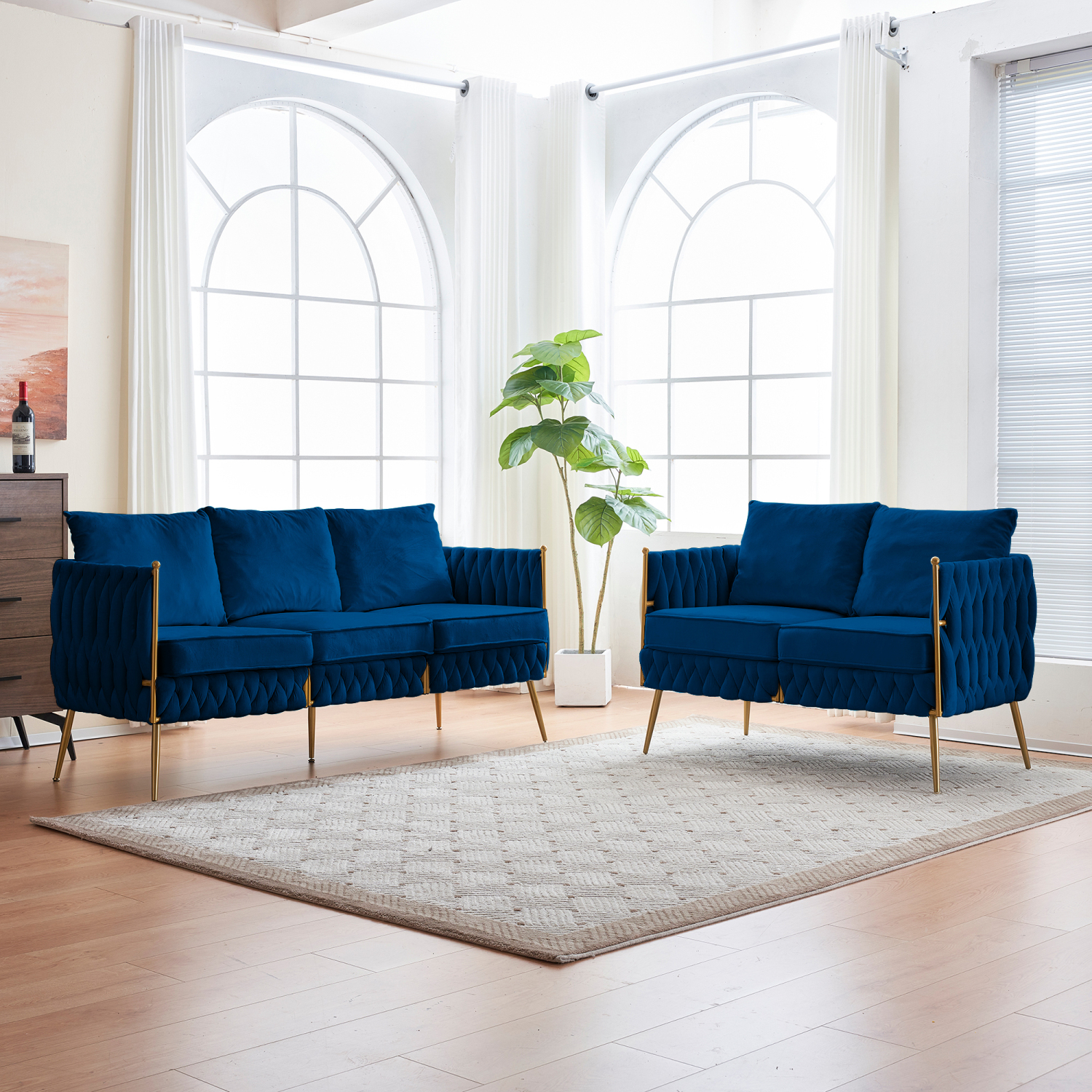 2 Pieces Velvet Sofa Couch Set - Comfy Loveseat and 3 Seater Sofa - Handmade Woven Back Modern Couch Set for Living Room - Blue Velvet