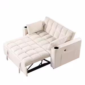 Harper & Bright Designs 55.3 in. Milky White Multi-functional Velvet Twin Size Sofa Bed with 2 Pillows Cup Holder USB Port and Side Pockets