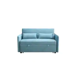 HOMEFUN 57 in. Blue Modern Velvet Adjustable Pull Out Sofa Bed with 2 Side Pockets and Pillows