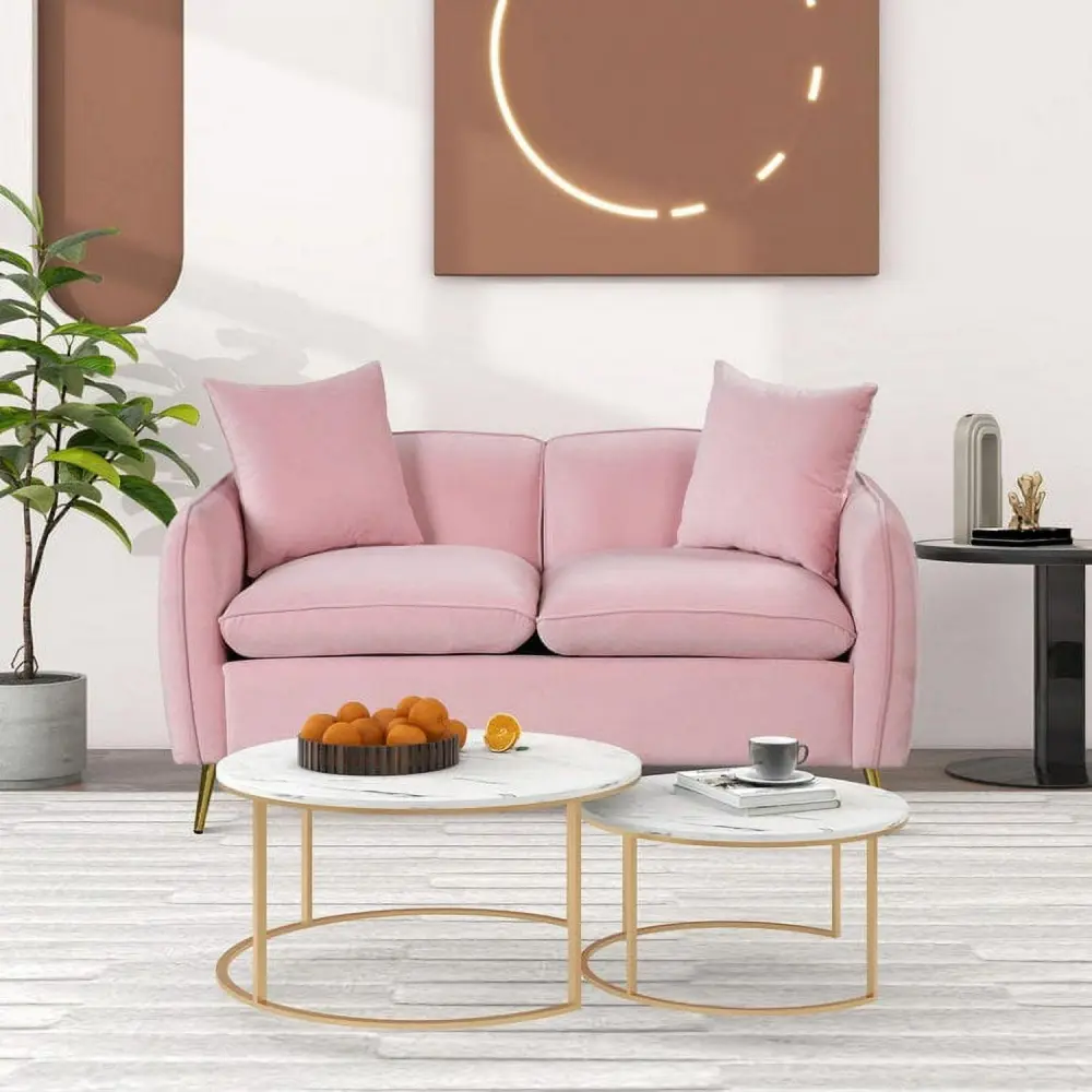 Euroco Velvet Loveseat Sofa, Upholstered Loveseat Couch with 2 Pillows Modern Sofa with Golden Metal Legs for Living Room, Apartment, Pink, 57.8