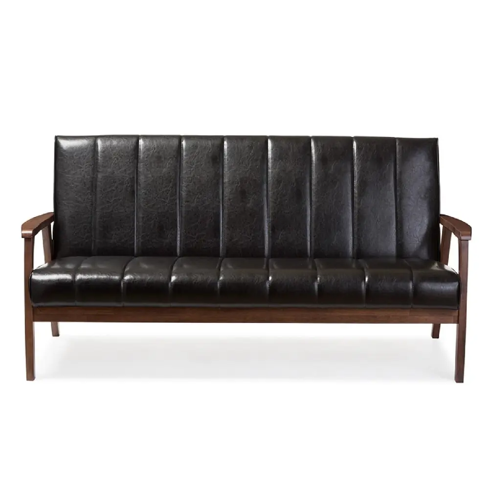 Baxton Studio Nikko Mid-century Modern Scandinavian Style Black Faux Leather Wooden 3-Seater Sofa