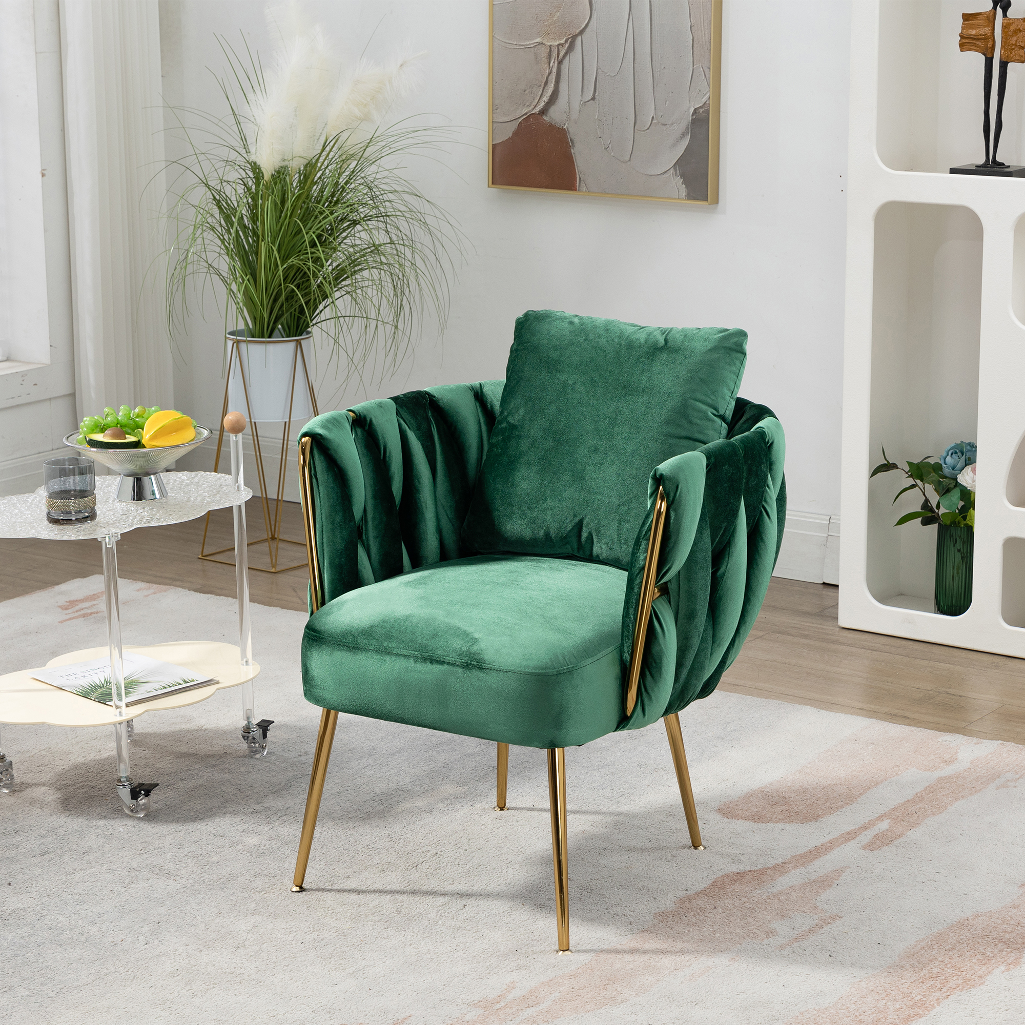 FOAUUH 27.4" Wide Modern Velvet Accent Chair Armchair Handmade Weaving Upholstered Reading Chair Single Sofa with Gold Metal Leg and Throw Pillow for Living Room Bedroom Dorm Room Office, Green Velvet