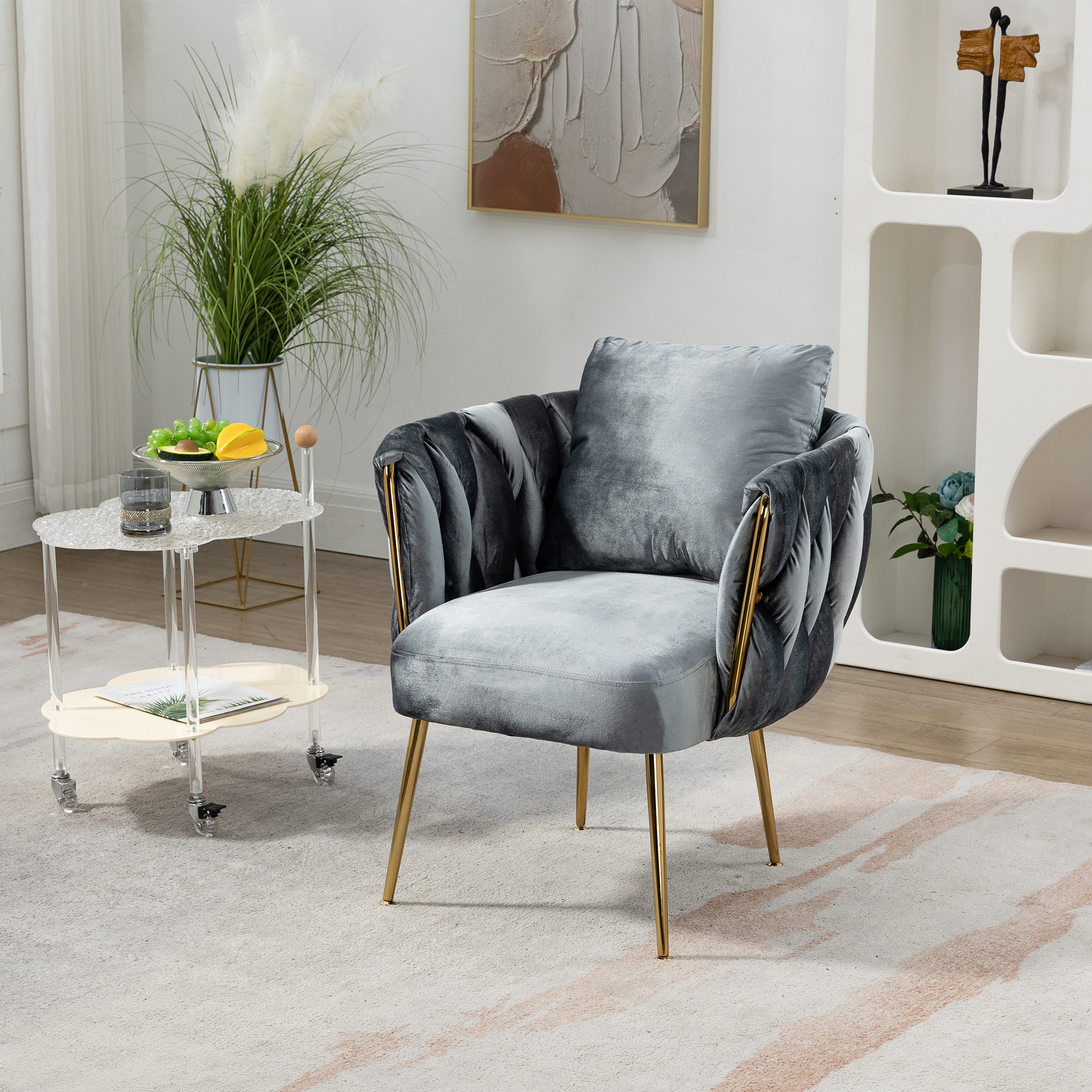 FOAUUH 27.4" Wide Modern Velvet Accent Chair Armchair Handmade Weaving Upholstered Reading Chair Single Sofa with Gold Metal Leg and Throw Pillow for Living Room Bedroom Dorm Room Office, Gray Velvet