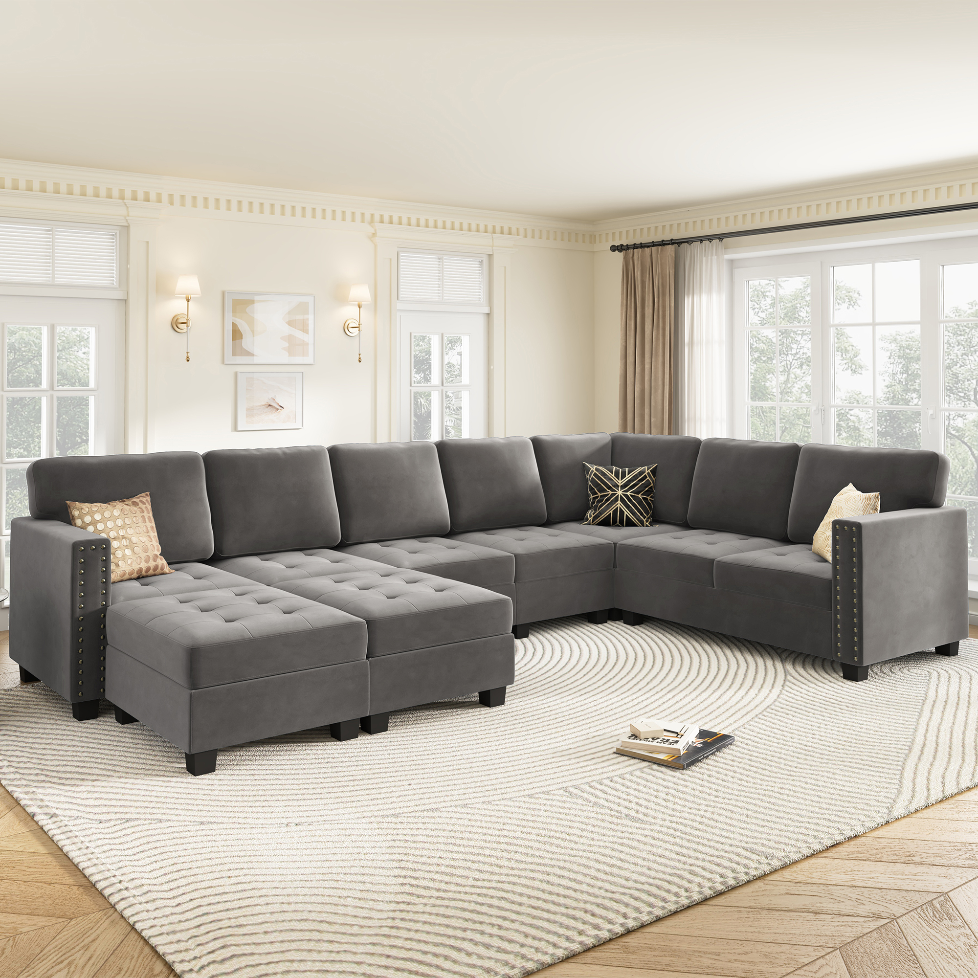 Sobaniilo 116" Sectional Sofa Couch with Reversible Chaise, Velvet L-Shaped Couch Sofa 4-seat Modular Large Sectional Couch with Ottoman for Living Room, Upholstered Cushion, Gray