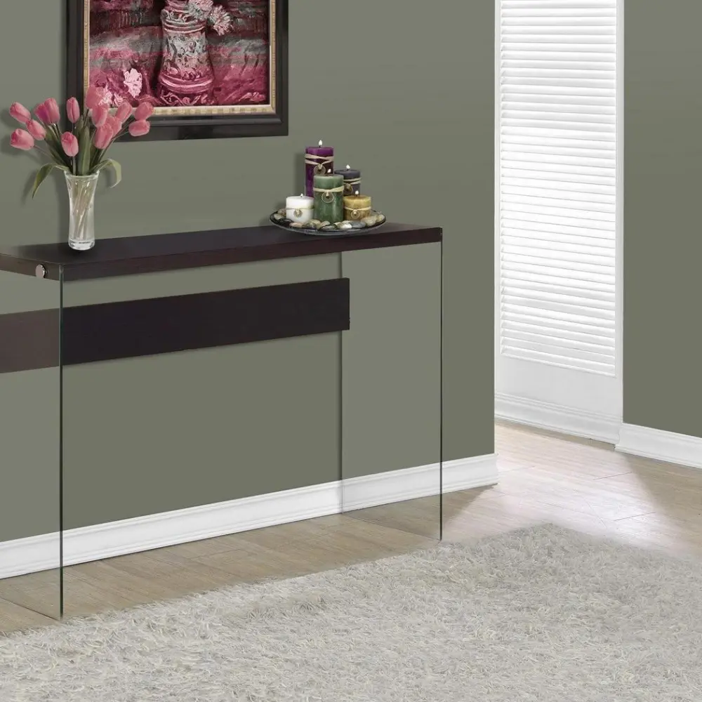 Accent Table, Console, Entryway, Narrow, Sofa, Living Room, Bedroom, Tempered Glass, Laminate, Brown, Clear, Contemporary, Modern